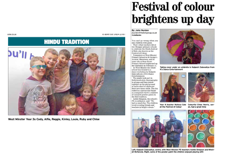 You can’t go wrong when you mix children with paint. That’s what teachers did at two Sheppey primary schools to celebrate the Hindu festival of Holi, also known as the Festival of Colour. Youngsters at West Minster Primary School in St George’s Avenue, Sheerness, and its sister site at Rose Street Primary School brightened up the timetable on February 11. At West Minster the whole school was treated to a dance workshop by Kalpesh Zalavadiyato of K’z Dance Entertainment.